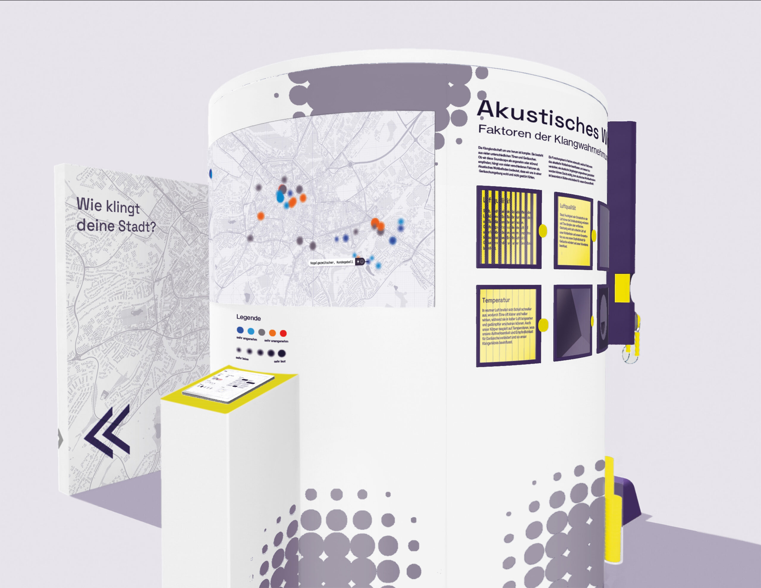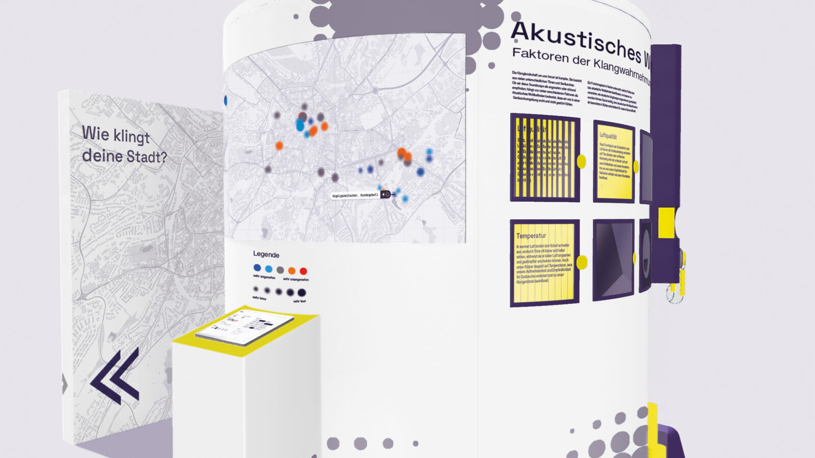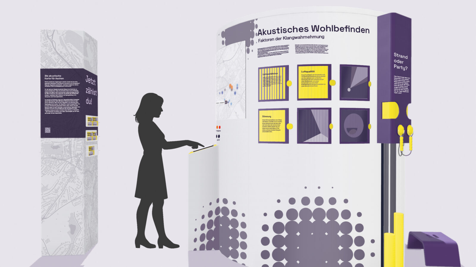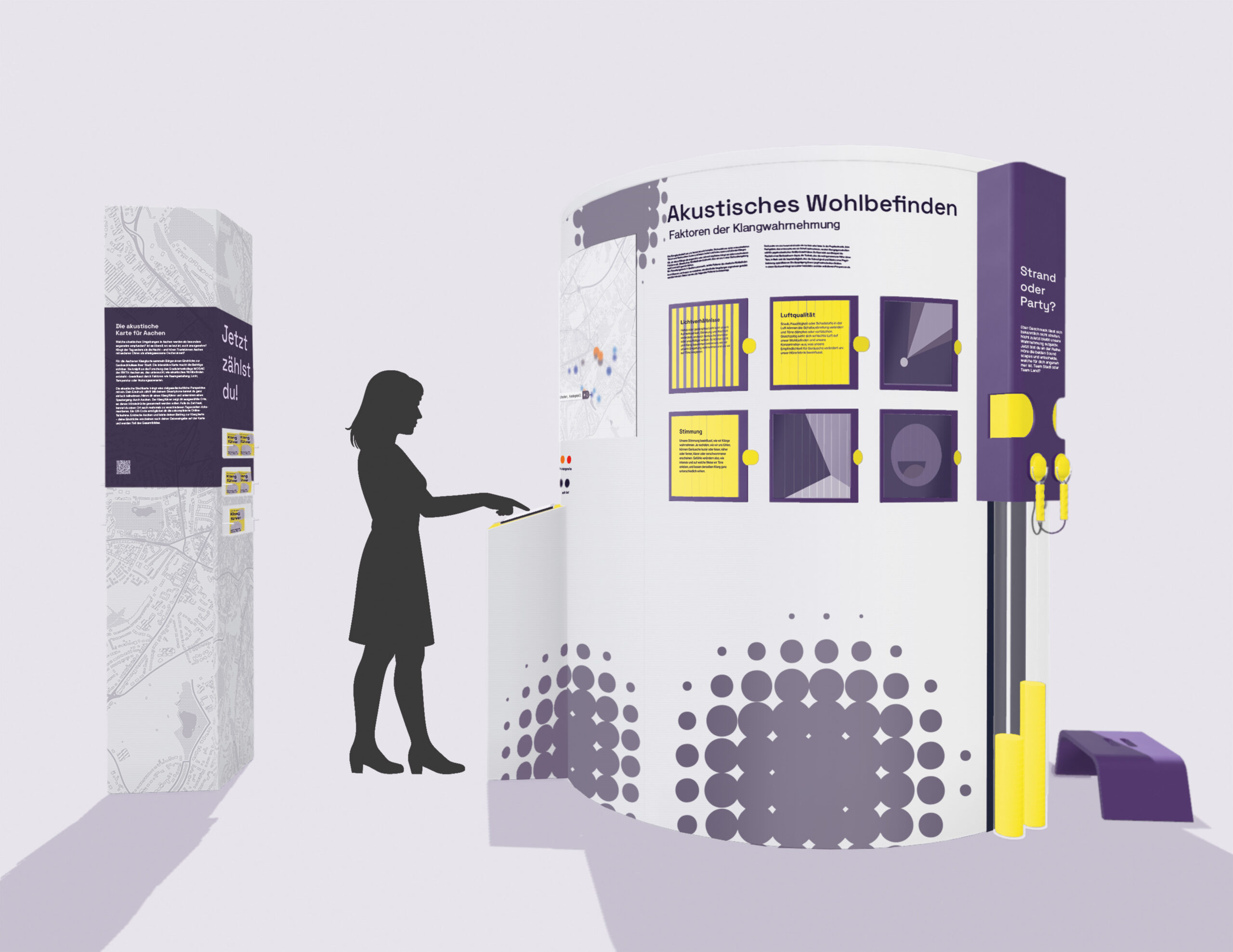 Wie könnte eine mobile Ausstellung gestaltet sein, die Aufmerksamkeit für ein Citizen-Science Projekt erzeugt und Bürger:innen zur Teilnahme anregt? Ausgehend von dieser Fragestellung wird ein mobiles und modulares Ausstellungskonzept für den Einsatz in halböffentlichen Räumen erarbeitet, das thematisch an ein Aachener Forschungsvorhaben zum akustischen Wohlbefinden anknüpft. Möglichst viele Bürger:innen sollen als Citizen Scientists ihre subjektiven Einschätzungen zu Lautstärke und akustischem Komfort in Aachener Klangräumen zu einer Datensammlung beitragen. Daraus entsteht eine kartografische Visualisierung, welche die gesammelten Daten im Rahmen der Ausstellung abbildet. Die Sammlung kann wichtige Perspektiven zur akustischen Aufwertung städtischer Orte bieten, etwa durch Maßnahmen wie Musik im Straßenraum. Das Konzept umfasst fünf Stationen, die niedrigschwellig in das Thema der akustischen Wahrnehmung einführen und eine direkte Beteiligungsmöglichkeit an der akustischen Stadtkarte von Aachen bieten.