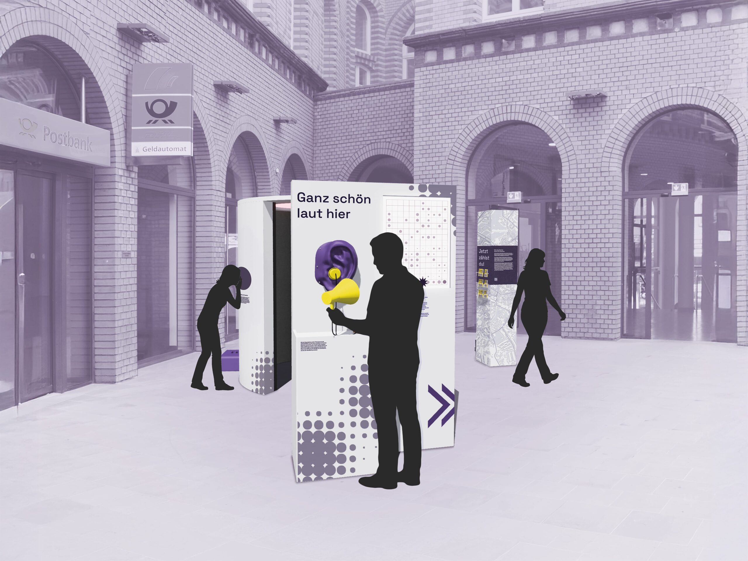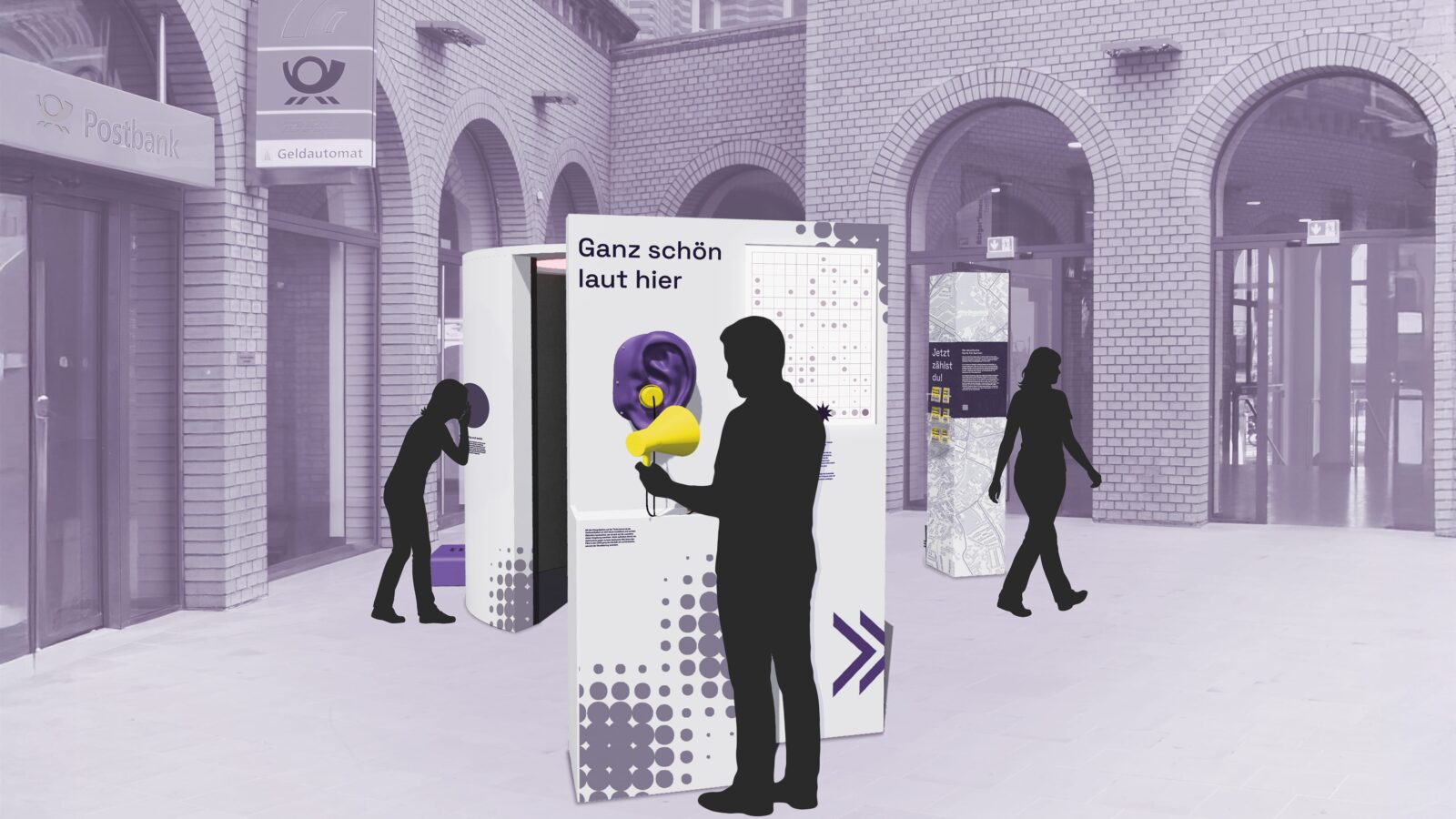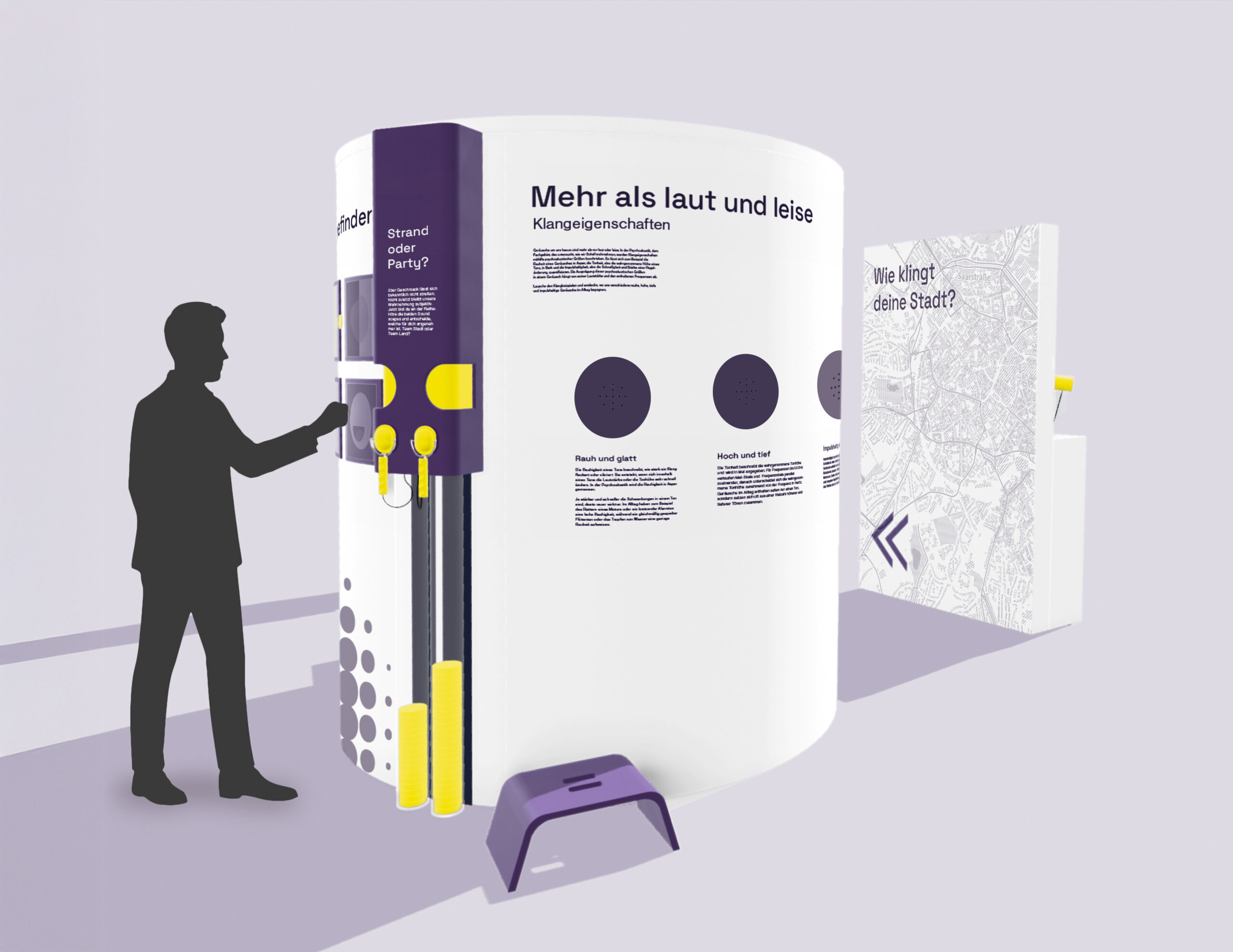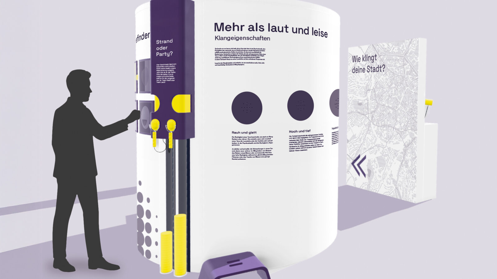 Wie könnte eine mobile Ausstellung gestaltet sein, die Aufmerksamkeit für ein Citizen-Science Projekt erzeugt und Bürger:innen zur Teilnahme anregt? Ausgehend von dieser Fragestellung wird ein mobiles und modulares Ausstellungskonzept für den Einsatz in halböffentlichen Räumen erarbeitet, das thematisch an ein Aachener Forschungsvorhaben zum akustischen Wohlbefinden anknüpft. Möglichst viele Bürger:innen sollen als Citizen Scientists ihre subjektiven Einschätzungen zu Lautstärke und akustischem Komfort in Aachener Klangräumen zu einer Datensammlung beitragen. Daraus entsteht eine kartografische Visualisierung, welche die gesammelten Daten im Rahmen der Ausstellung abbildet. Die Sammlung kann wichtige Perspektiven zur akustischen Aufwertung städtischer Orte bieten, etwa durch Maßnahmen wie Musik im Straßenraum. Das Konzept umfasst fünf Stationen, die niedrigschwellig in das Thema der akustischen Wahrnehmung einführen und eine direkte Beteiligungsmöglichkeit an der akustischen Stadtkarte von Aachen bieten.
