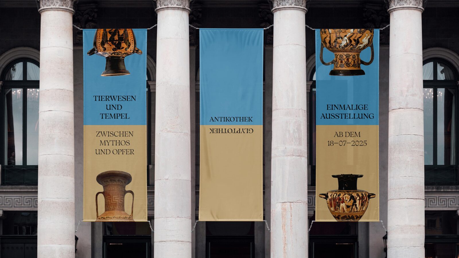 Die Staatliche Antikensammlungen und die Glyptothek in München bilden das einmalige Museumsduo am Königsplatz. Ihre Sammlungen umfassen einige der bedeutendsten Zeugnisse antiker Kunst, von klassischer Skulptur über Vasenmalerei bis hin zu einzigartigen Exponaten der Kleinkunst. Das neue Corporate Design greift die architektonische Besonderheit auf: Zwei spiegelbildlich angeordnete Museumsbauten, getrennt durch eine Straße, welche aus der Vogelperspektive als horizontale Spiegelachse wahrgenommen werden kann. Auch die klassizistischen Fassaden mit jeweils acht Säulen und fast identischen Proportionen unterstreichen diesen Eindruck. Die Idee der Spiegelung wird daher zum zentralen Gestaltungselement, welches Ordnung, Harmonie und historische Kontinuität vermittelt. Es schafft eine klare visuelle Identität, welche die beiden Häuser vereint und flexibel über alle Medien hinweg funktioniert.