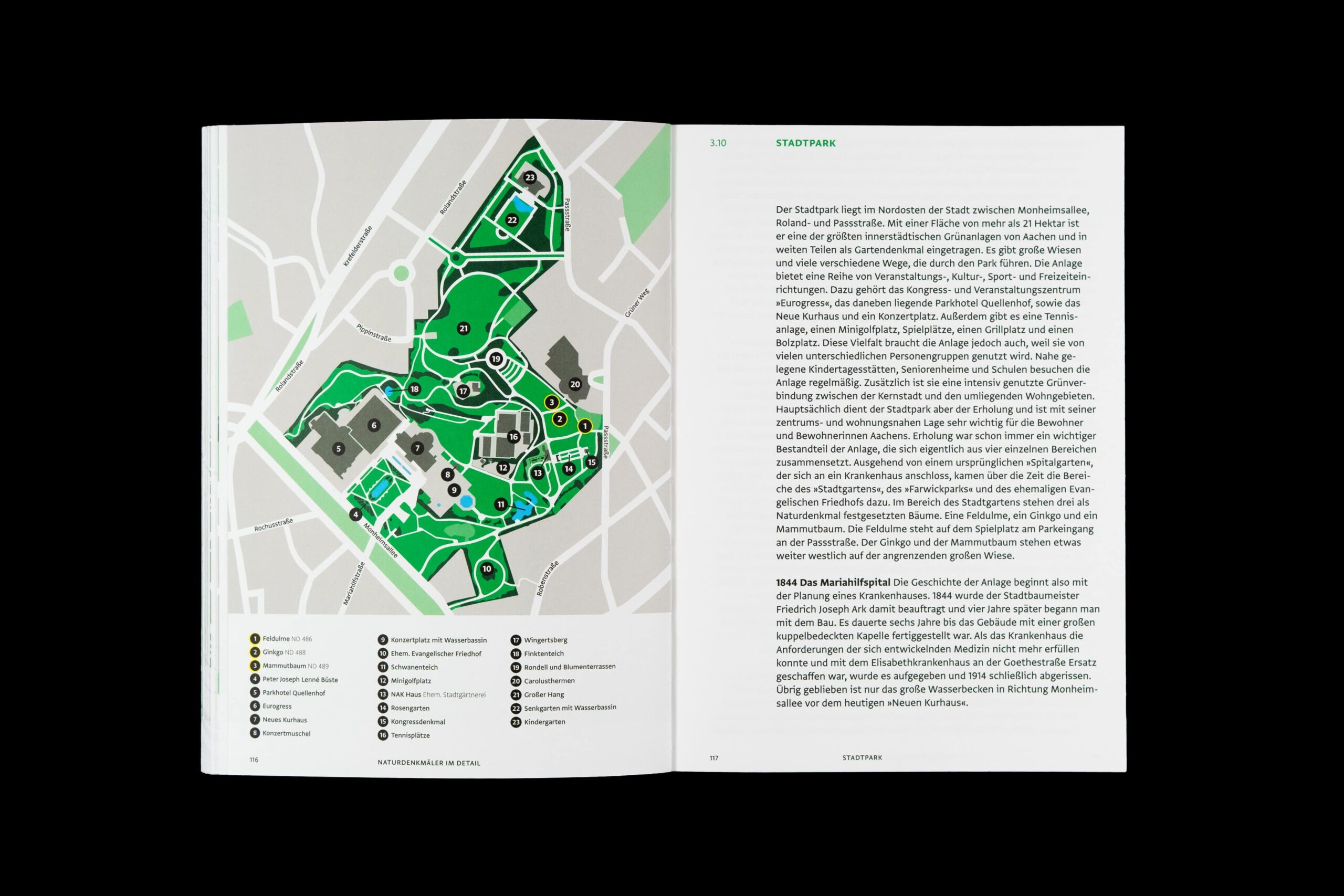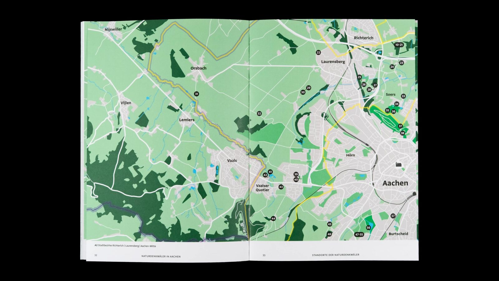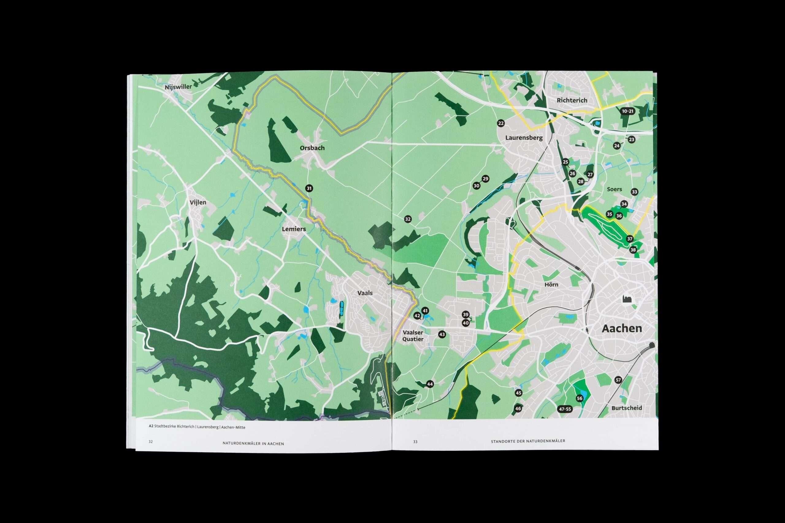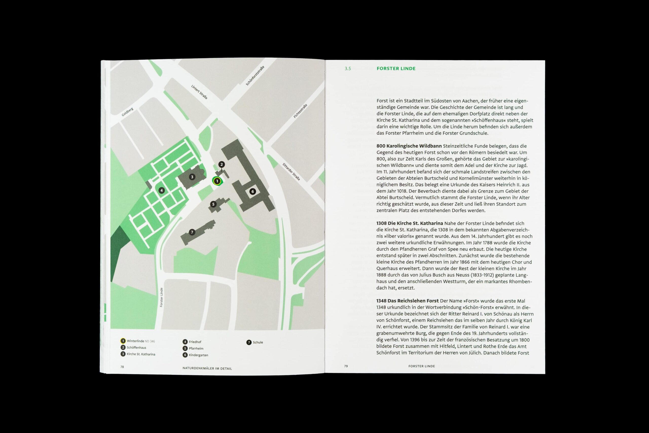 Als Naturdenkmal können Einzelschöpfungen der Natur, wie zum Beispiel Bäume, Quellen oder Felsen, unter besonderen Schutz gestellt werden. In Aachen gibt es viele alte Bäume, die diesen besonderen Schutz genießen und an ihren Standorten deshalb schon viel erlebt oder auch überlebt haben. Die Bachelorarbeit »Grüne Zeitzeugen — Naturdenkmäler in Aachen« erklärt, was Naturdenkmäler sind und wie sie geschützt werden. Sie stellt den Aachener Naturdenkmalbestand umfangreich dar und geht auf ausgewählte Naturdenkmäler genauer ein, um diese im Detail zu zeigen und sie in den historischen Kontext ihres Standortes einzuordnen. Durch die Verbindung aus Texten, illustrierten Karten und Fotografien werden die Naturdenkmäler in einer Printpublikation für ein breites Publikum sichtbar und erkennbar gemacht. Ziel ist es, das Bewusstsein für denkmalhafte Natur im unmittelbaren Stadtraum zu stärken.