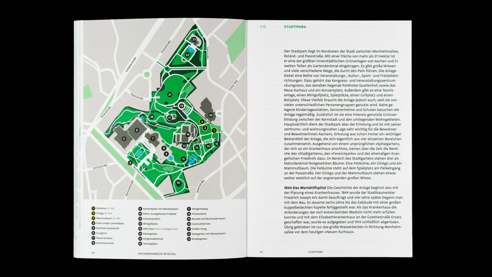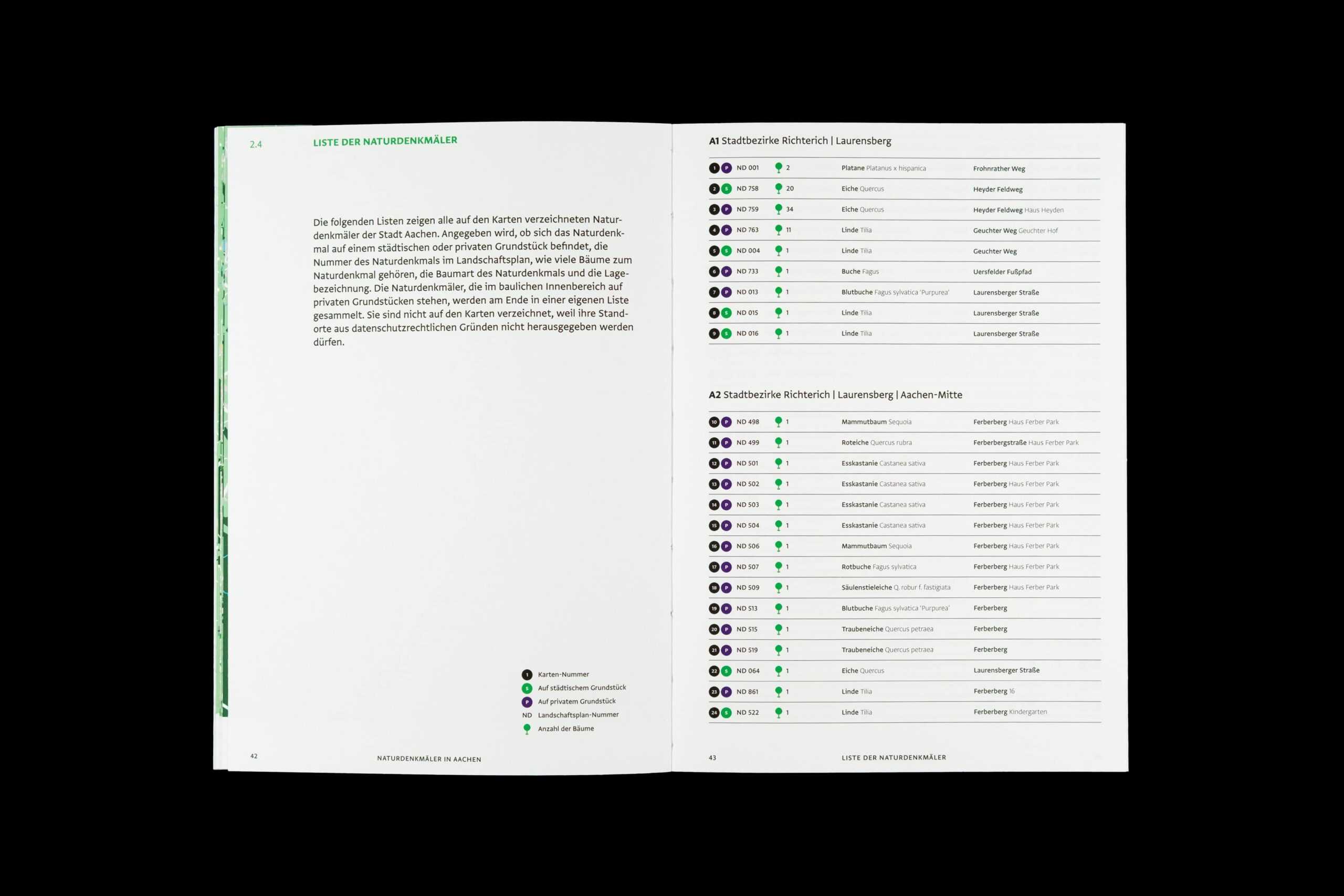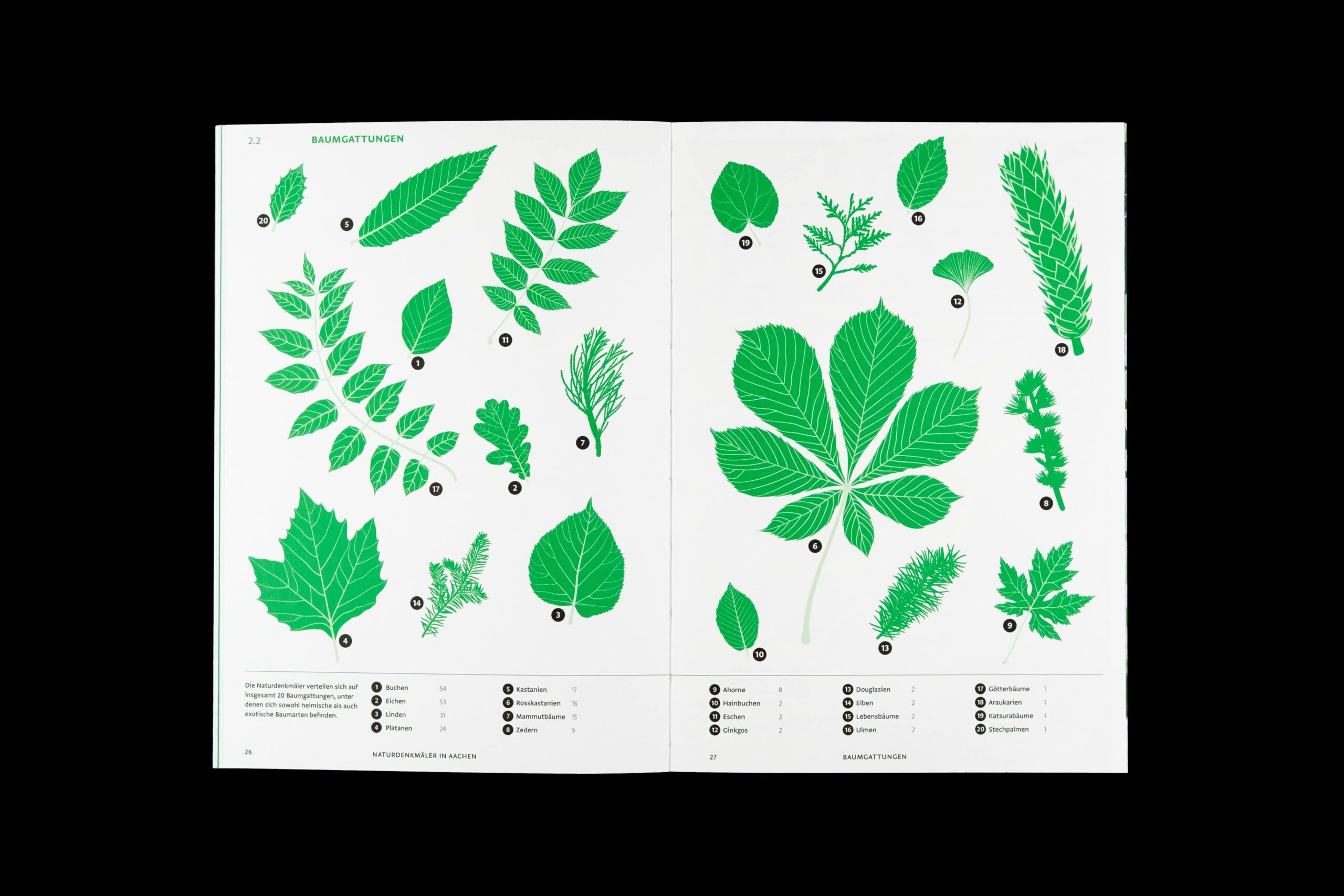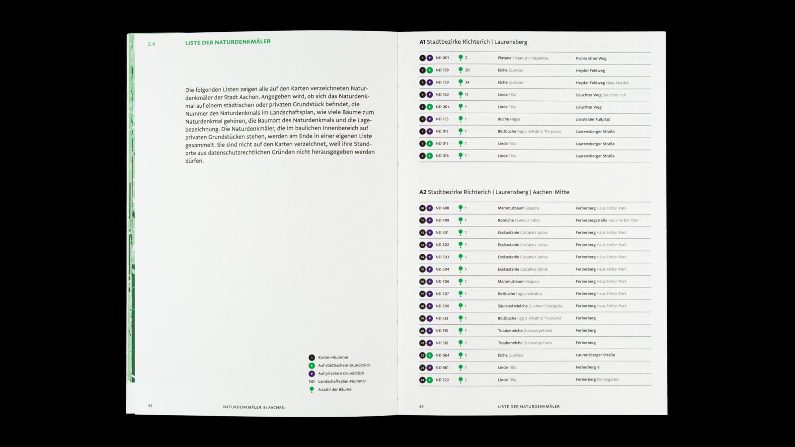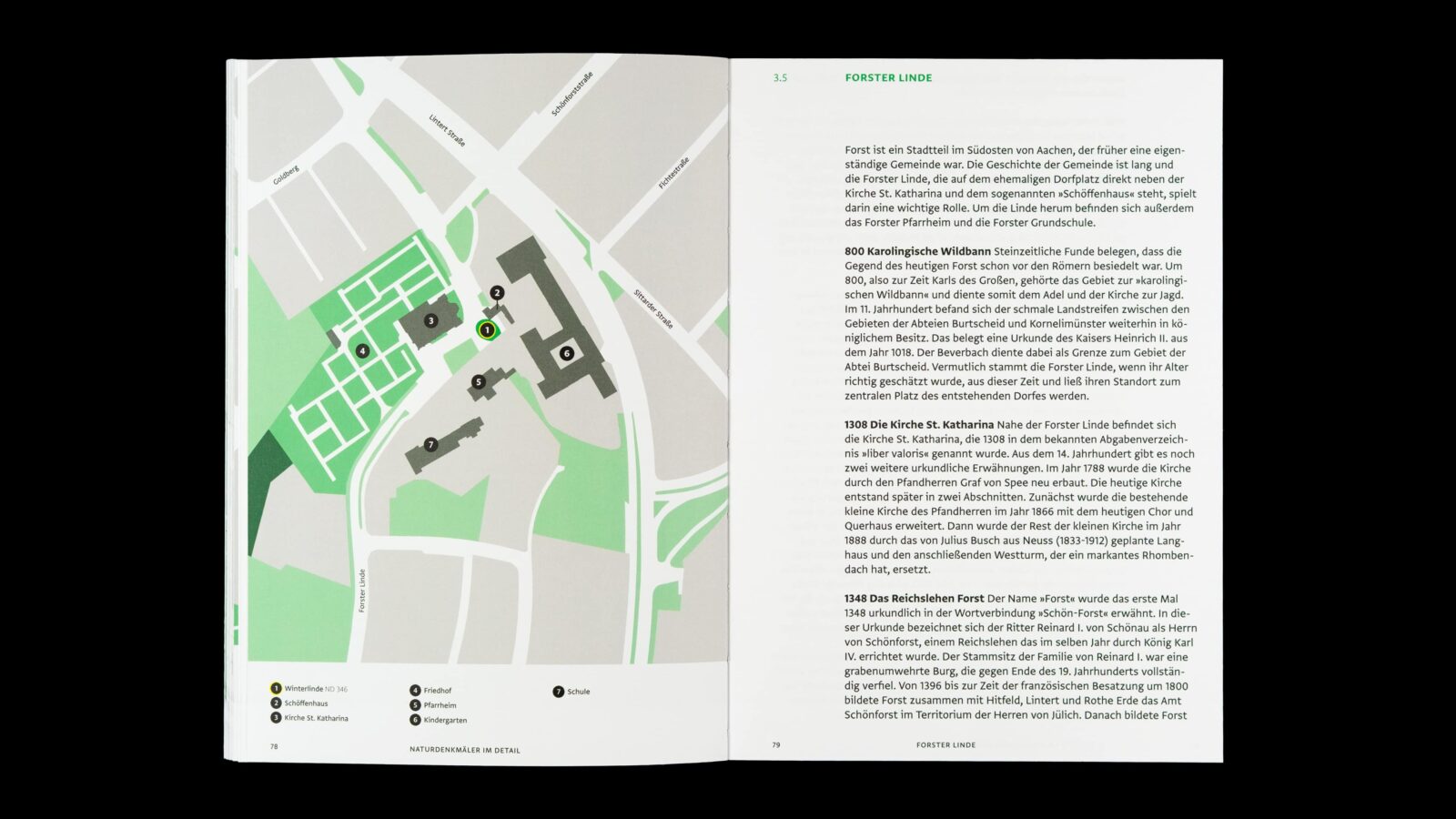 Als Naturdenkmal können Einzelschöpfungen der Natur, wie zum Beispiel Bäume, Quellen oder Felsen, unter besonderen Schutz gestellt werden. In Aachen gibt es viele alte Bäume, die diesen besonderen Schutz genießen und an ihren Standorten deshalb schon viel erlebt oder auch überlebt haben. Die Bachelorarbeit »Grüne Zeitzeugen — Naturdenkmäler in Aachen« erklärt, was Naturdenkmäler sind und wie sie geschützt werden. Sie stellt den Aachener Naturdenkmalbestand umfangreich dar und geht auf ausgewählte Naturdenkmäler genauer ein, um diese im Detail zu zeigen und sie in den historischen Kontext ihres Standortes einzuordnen. Durch die Verbindung aus Texten, illustrierten Karten und Fotografien werden die Naturdenkmäler in einer Printpublikation für ein breites Publikum sichtbar und erkennbar gemacht. Ziel ist es, das Bewusstsein für denkmalhafte Natur im unmittelbaren Stadtraum zu stärken.