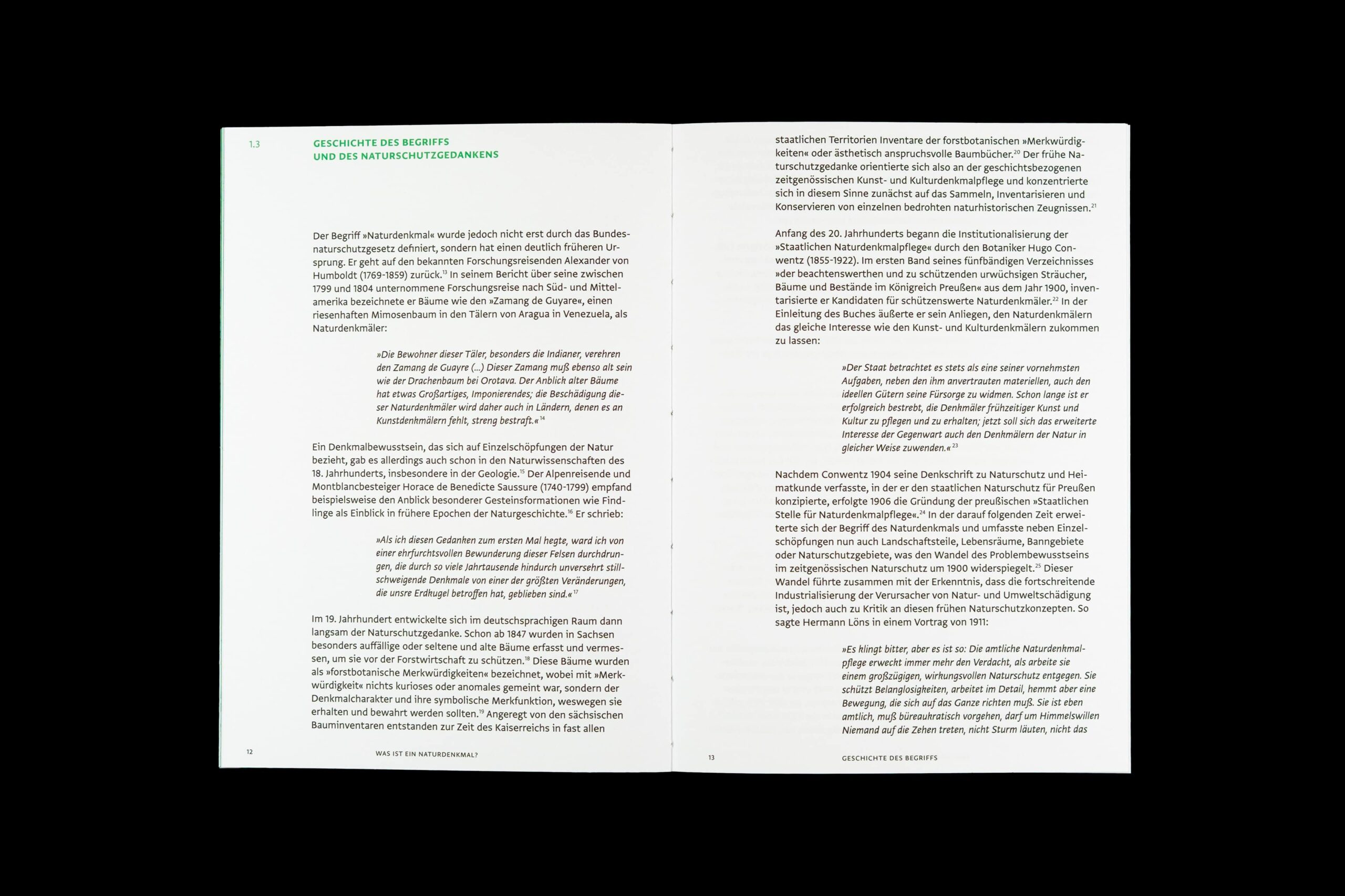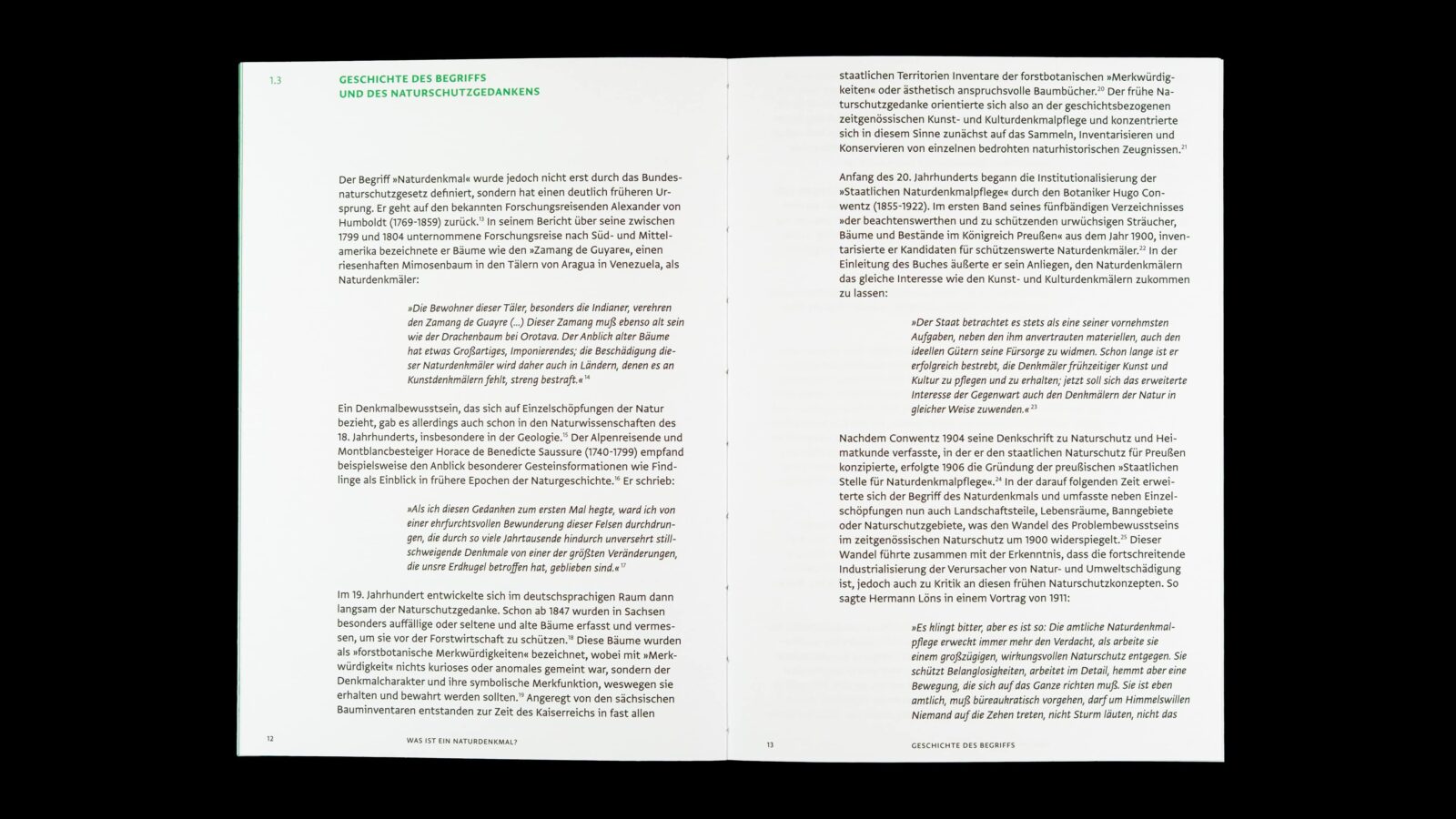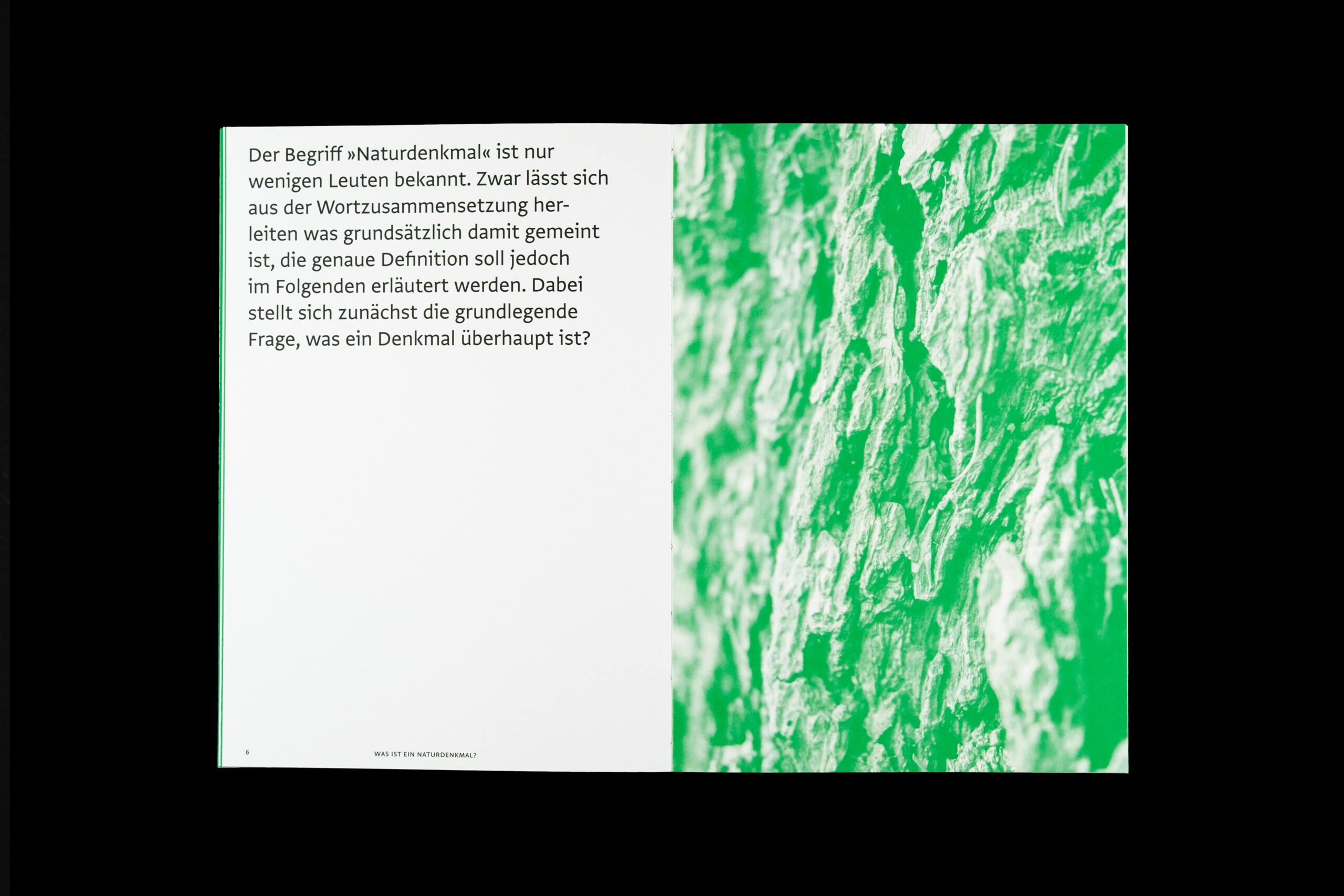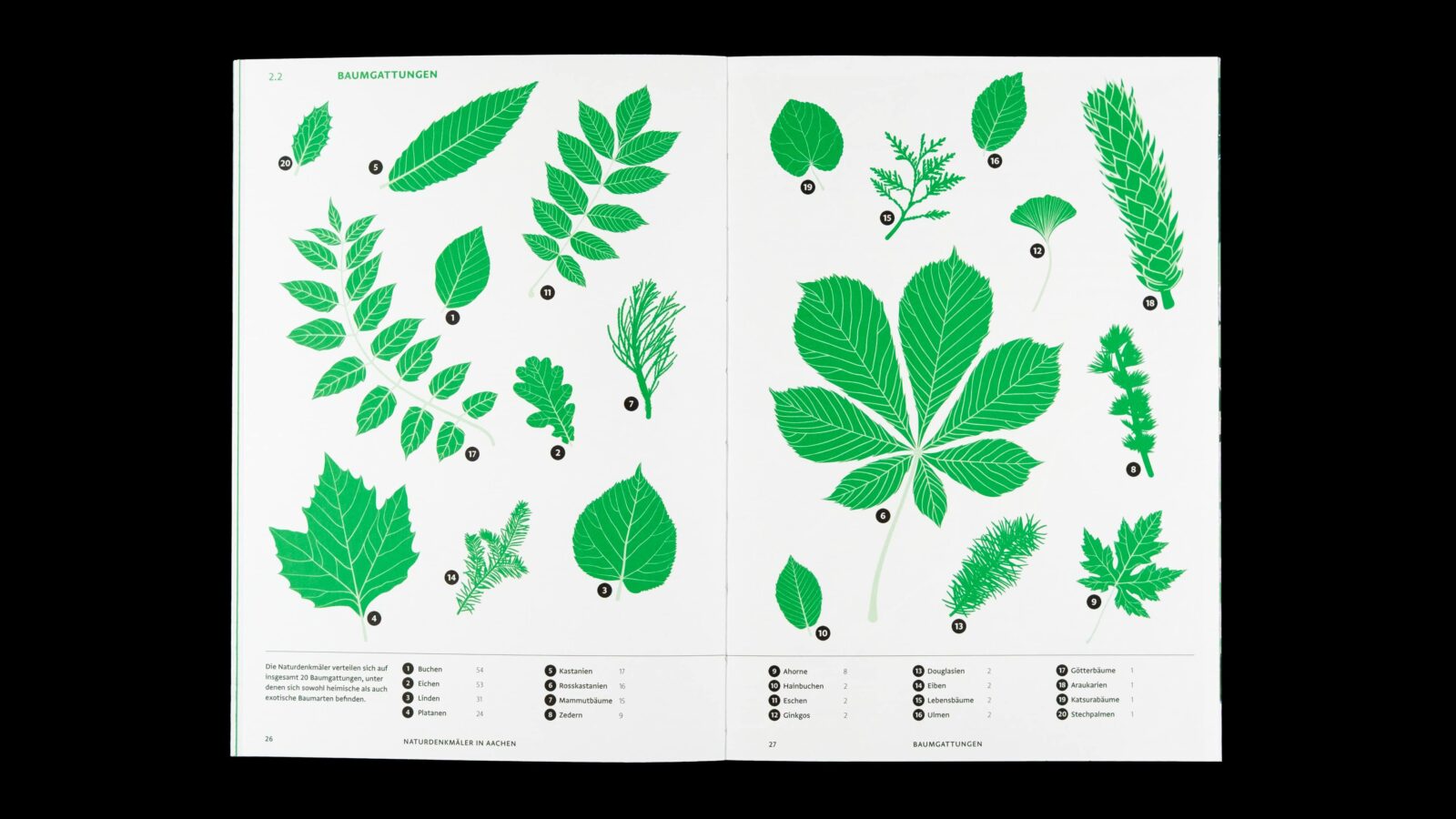 Als Naturdenkmal können Einzelschöpfungen der Natur, wie zum Beispiel Bäume, Quellen oder Felsen, unter besonderen Schutz gestellt werden. In Aachen gibt es viele alte Bäume, die diesen besonderen Schutz genießen und an ihren Standorten deshalb schon viel erlebt oder auch überlebt haben. Die Bachelorarbeit »Grüne Zeitzeugen — Naturdenkmäler in Aachen« erklärt, was Naturdenkmäler sind und wie sie geschützt werden. Sie stellt den Aachener Naturdenkmalbestand umfangreich dar und geht auf ausgewählte Naturdenkmäler genauer ein, um diese im Detail zu zeigen und sie in den historischen Kontext ihres Standortes einzuordnen. Durch die Verbindung aus Texten, illustrierten Karten und Fotografien werden die Naturdenkmäler in einer Printpublikation für ein breites Publikum sichtbar und erkennbar gemacht. Ziel ist es, das Bewusstsein für denkmalhafte Natur im unmittelbaren Stadtraum zu stärken.