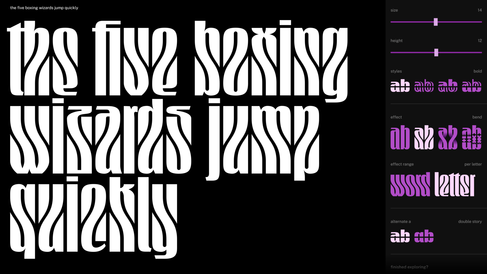 Spine Sans – Erkundung des generativen Potenzials modularer Typografie. „Spine Sans“ ist eine dekorative Schriftfamilie, die mit modularen Limitationen gestaltet wurde. Kleinbuchstaben sind in eine obere und untere Hälfte unterteilt, zwischen denen Raum für spannende generative Effekte entsteht. Schriftzeichen und Effekte wurden unabhängig voneinander, aber auf dem gleichen Spaltenraster gestaltet und passen daher nahtlos zusammen. Beispielhafte Varianten der „Spines“ können in einem speziell programmierten Web-Interface an selbst geschriebenen Text erkundet werden. Die Galerie an Optionen präsentiert mögliche Resultate für die spielerische Kombination. Die zwei Schriftschnitte „Spine Sans Bold“ und „Spine Sans Double“ können auch gemischt werden. Weiter ergänzbar um maßgeschneiderte Varianten, kann „Spine Sans“ besonders in interaktiven oder animierten Medien effektiv verschiedenste Eindrücke vermitteln.