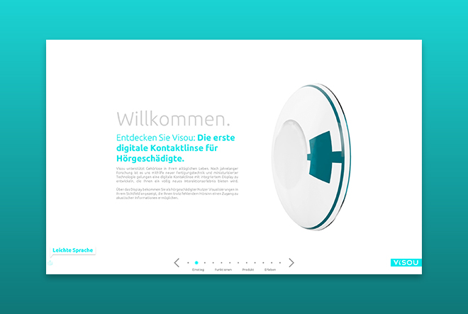 Mit Visou habe ich das grafische User Interface solch einer Linse entwickelt, welches Gehörlosen den Alltag erleichtern soll. So bekommt der hörgeschädigte Nutzer Visualisierungen in seinem Sichtfeld anzeigt, die den fehlenden Hörsinn kompensieren und einen Zugang zu akustischen Informationen ermöglichen. Zudem informieren crossmediale Begleitmedien potenzielle Nutzer über diese neue Technologie.