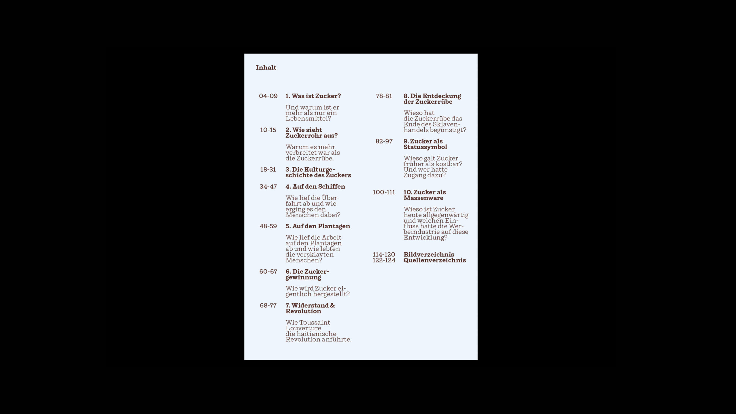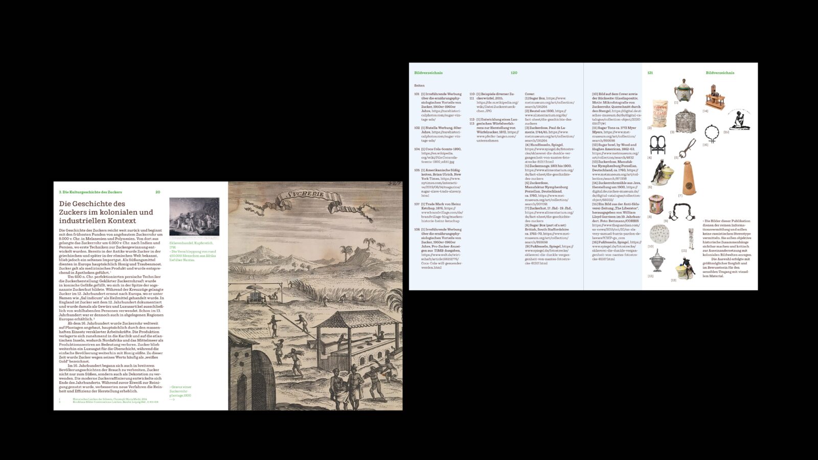 Zucker liefert Energie und ist für den menschlichen Stoffwechsel unverzichtbar. Heute ist er jedoch weit mehr als ein Nährstoff: Er prägt unseren Alltag, ist fester Bestandteil unzähliger industriell gefertigter Produkte und eng mit wirtschaftlichen sowie kulturellen Entwicklungen verbunden. Diese Arbeit geht der Frage nach, wie Zucker zu einem globalen Massenprodukt wurde. Im Fokus steht eine kulturhistorische und kritische Auseinandersetzung mit Zucker, die sowohl seine kolonialen Wurzeln als auch seine heutige Allgegenwart sichtbar macht. Die Inhalte werden in einem Printbuch anschaulich aufbereitet und durch visuelles Material ergänzt. Das Projekt lädt dazu ein, die Geschichte alltäglicher Konsumgüter bewusster wahrzunehmen und regt zur Auseinandersetzung mit einem gesunden Konsumverhalten an.