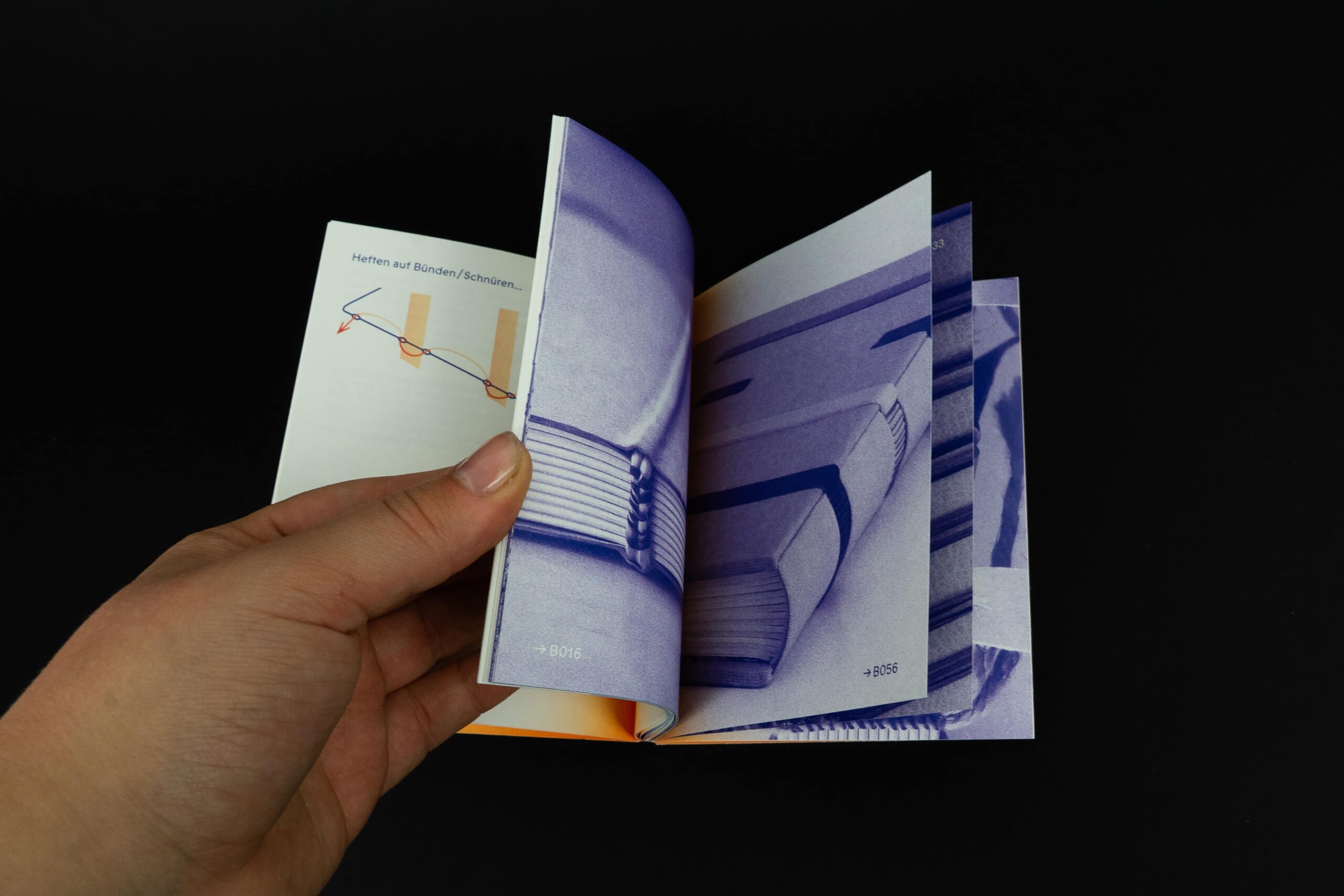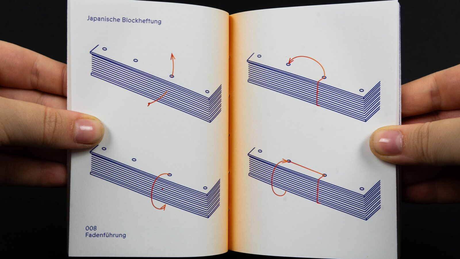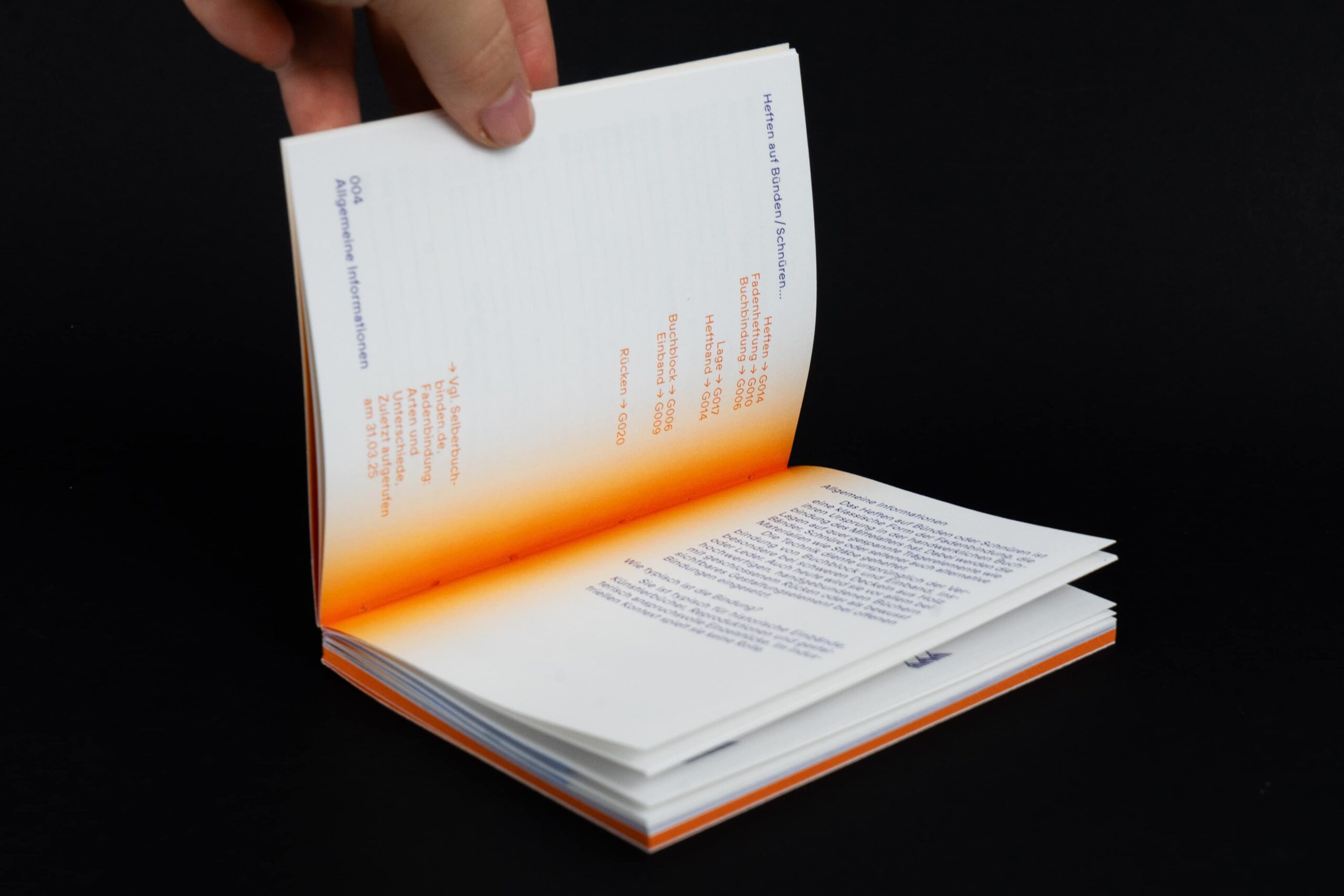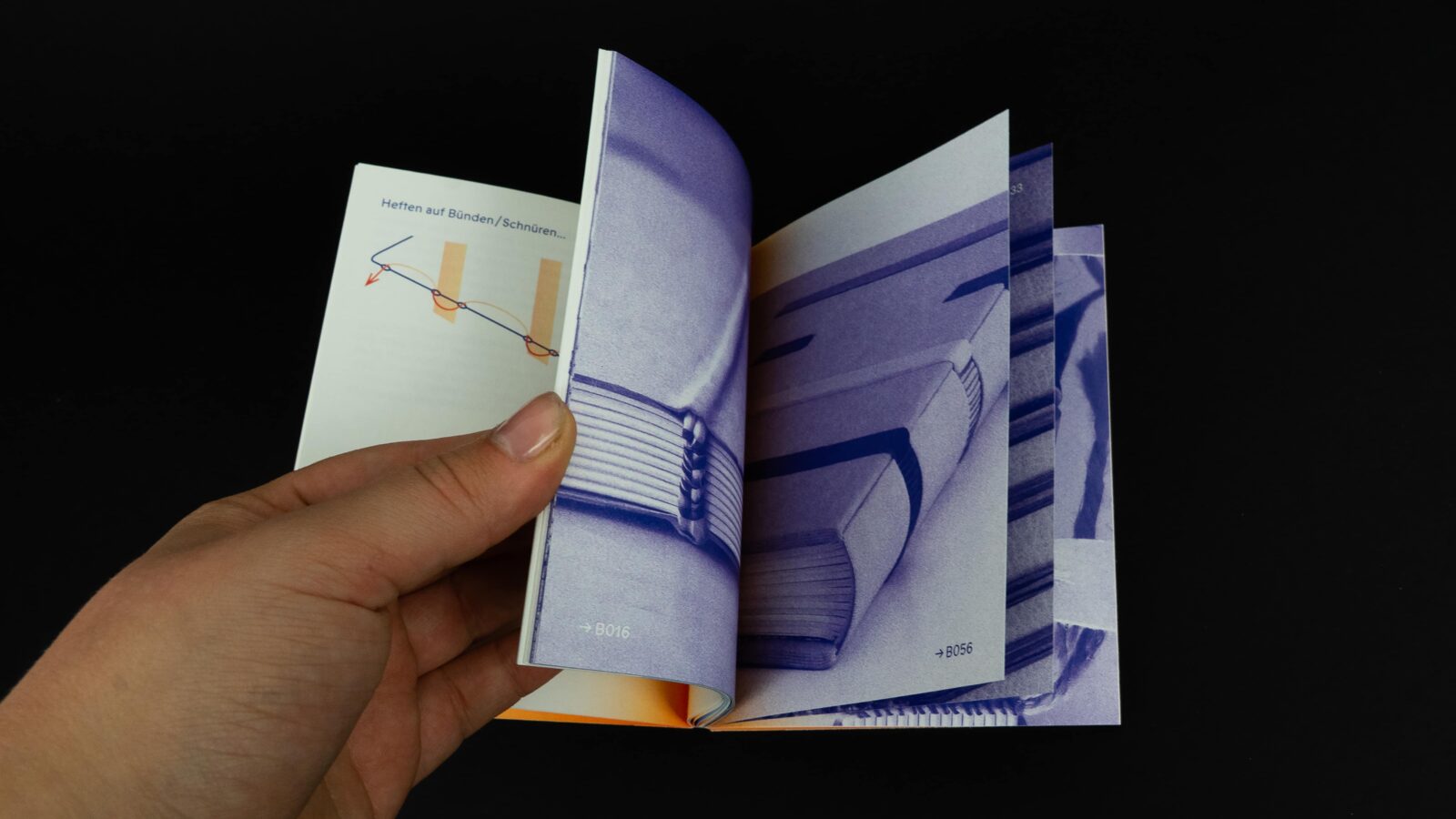 „Zwischen den Stichen“ untersucht Fadenbindungen als gestalterisches Mittel. In einer Box befinden sich handgebundene Einzelhefte, die verschiedene Bindungstechniken erklären, veranschaulichen und haptisch erfahrbar machen. Aspekte wie Fadenführung, Eigenschaften und Hinweise für Gestaltende bieten vielfältige Zugänge. Ein Begleitheft ergänzt das Projekt um theoretischen Hintergrund und gestalterische Einordnung. Ob zum Durchblättern oder zur vertieften Auseinandersetzung – diese Arbeit lädt dazu ein, Buchbindung in der Gestaltung neu zu denken.