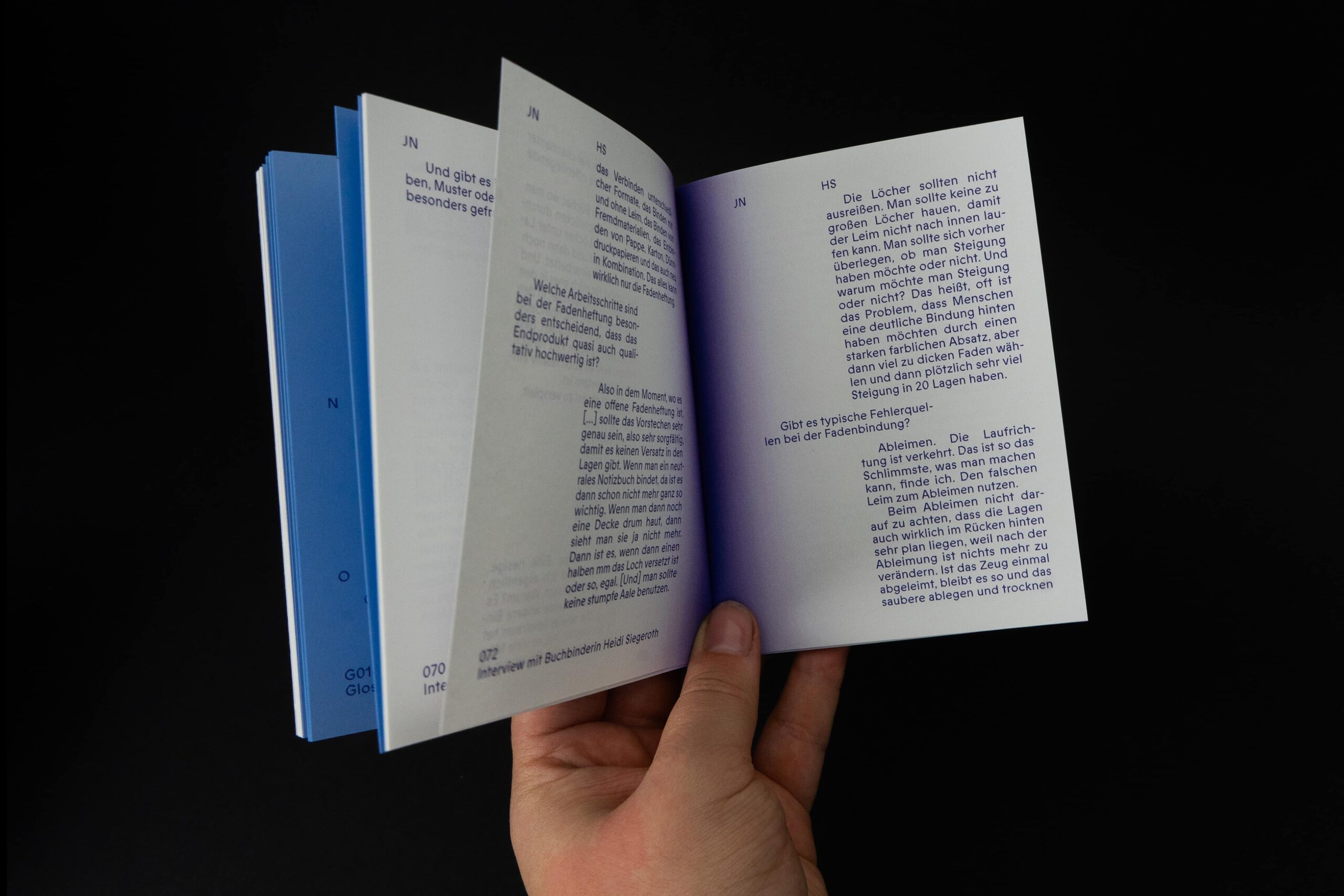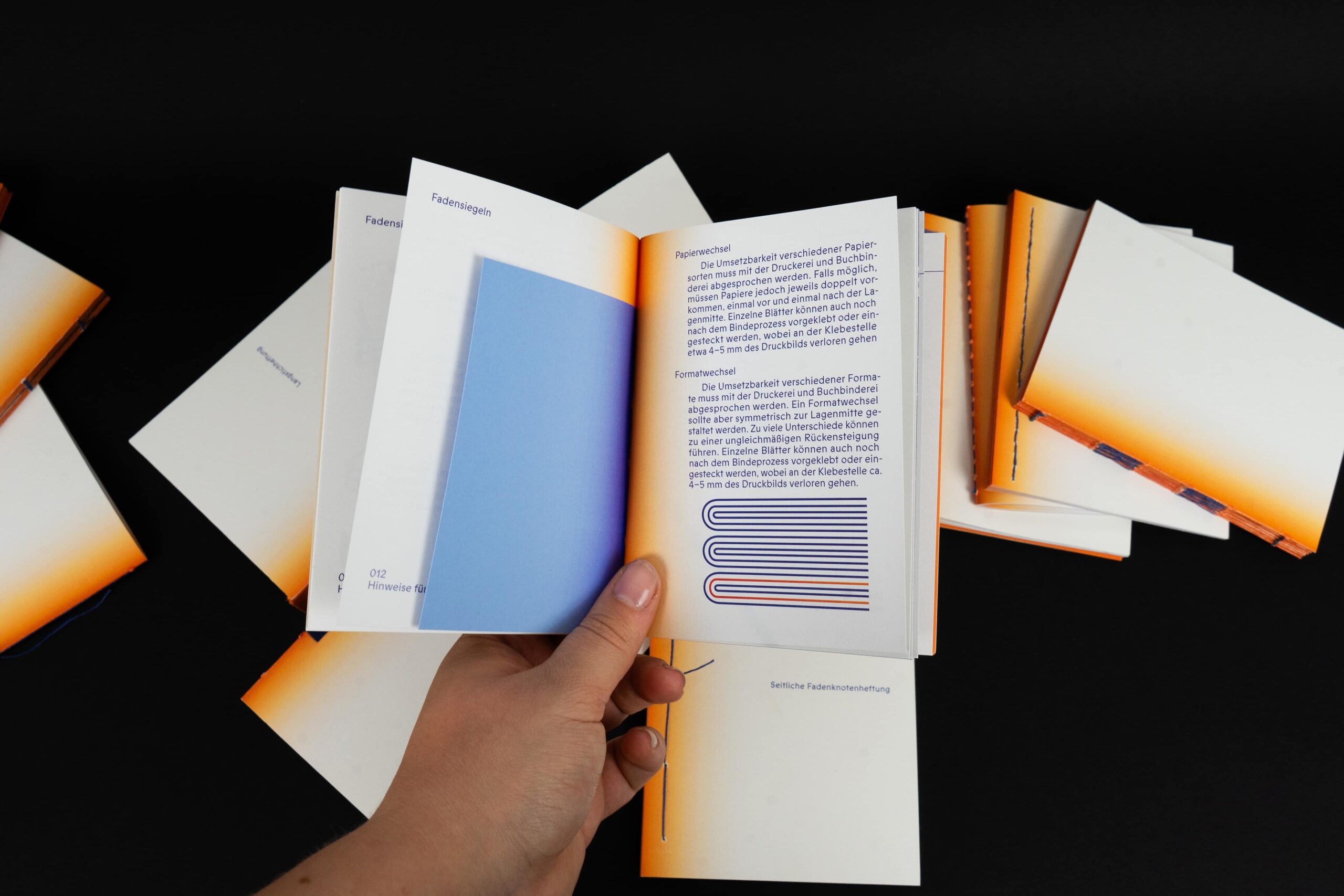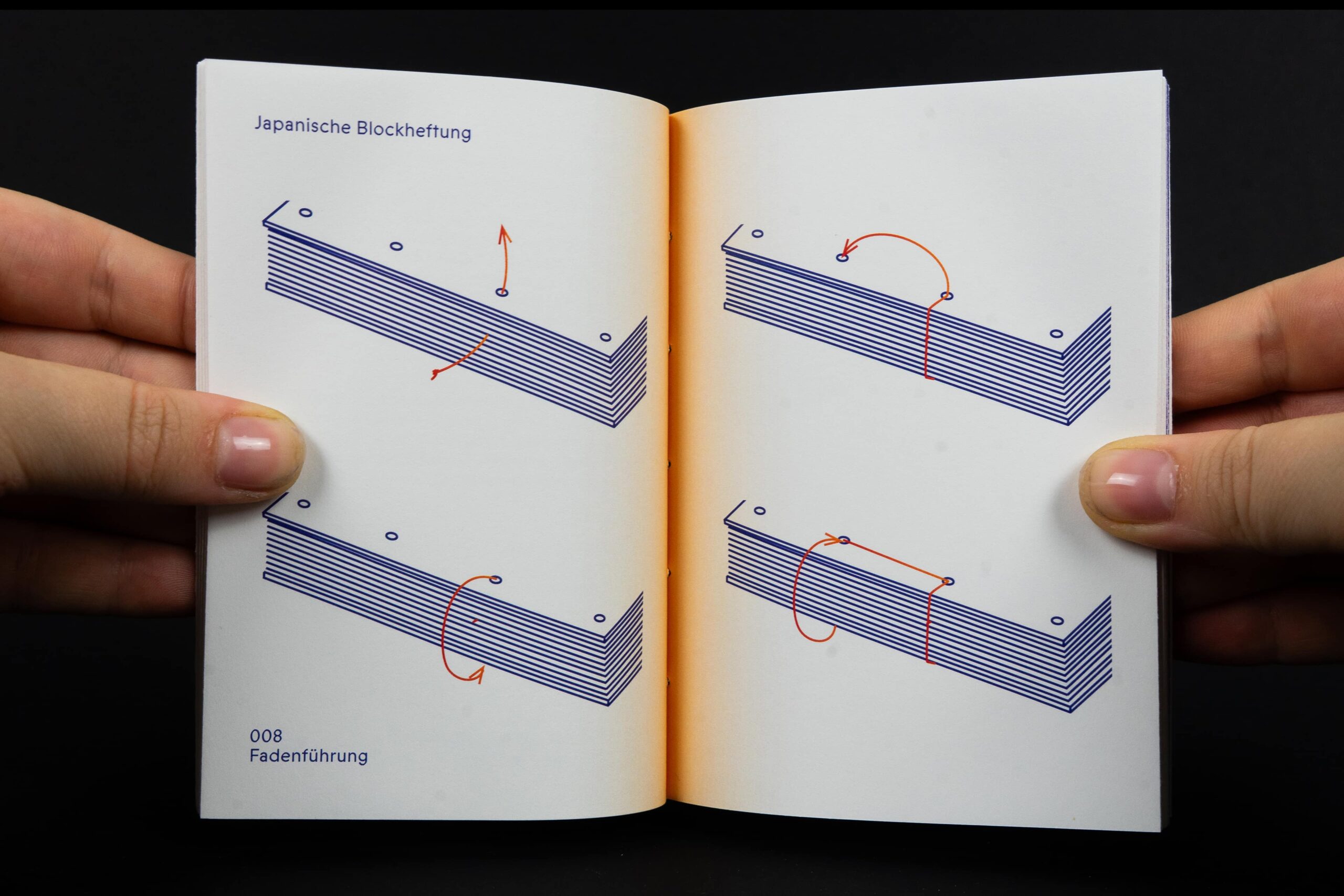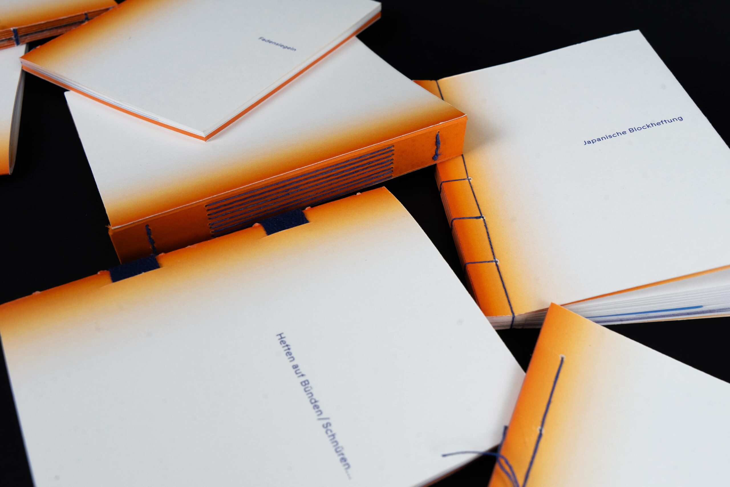 „Zwischen den Stichen“ untersucht Fadenbindungen als gestalterisches Mittel. In einer Box befinden sich handgebundene Einzelhefte, die verschiedene Bindungstechniken erklären, veranschaulichen und haptisch erfahrbar machen. Aspekte wie Fadenführung, Eigenschaften und Hinweise für Gestaltende bieten vielfältige Zugänge. Ein Begleitheft ergänzt das Projekt um theoretischen Hintergrund und gestalterische Einordnung. Ob zum Durchblättern oder zur vertieften Auseinandersetzung – diese Arbeit lädt dazu ein, Buchbindung in der Gestaltung neu zu denken.