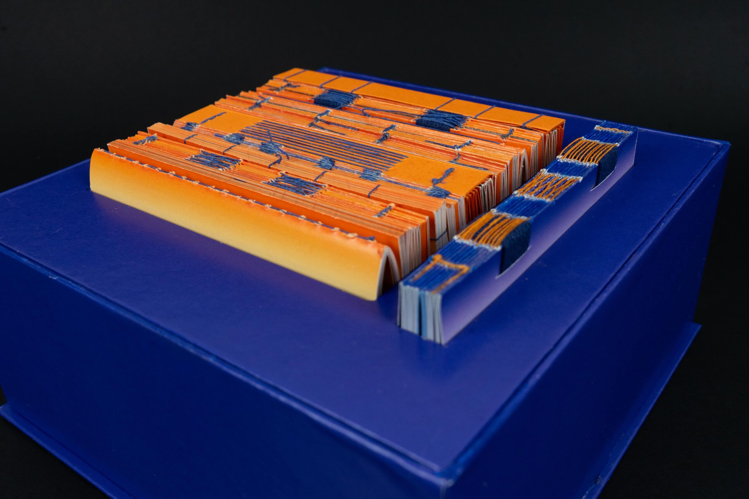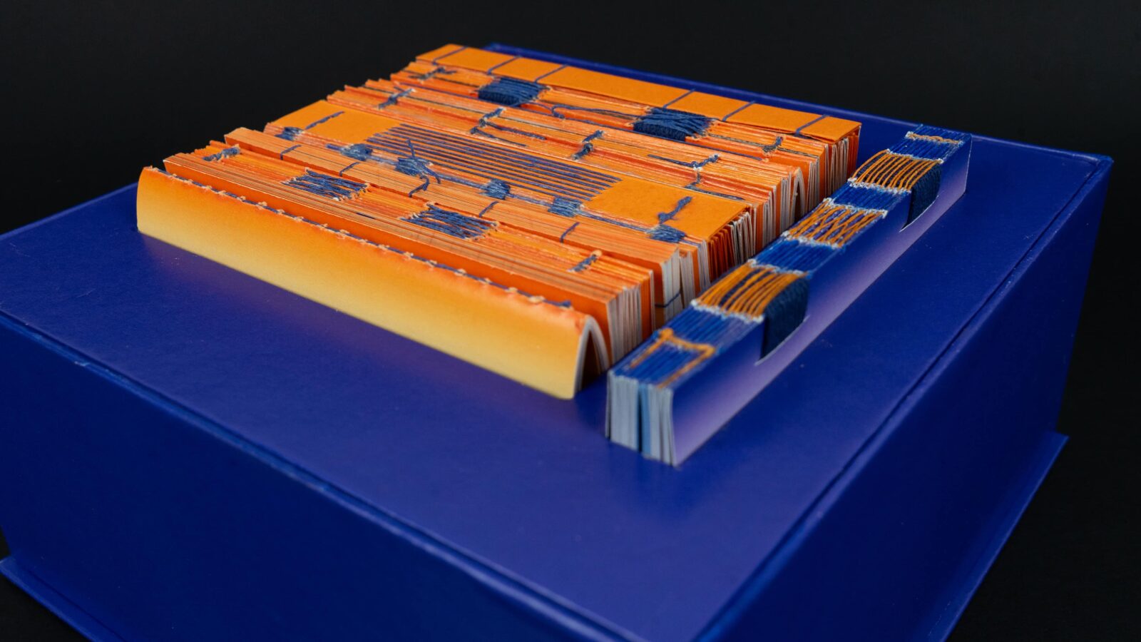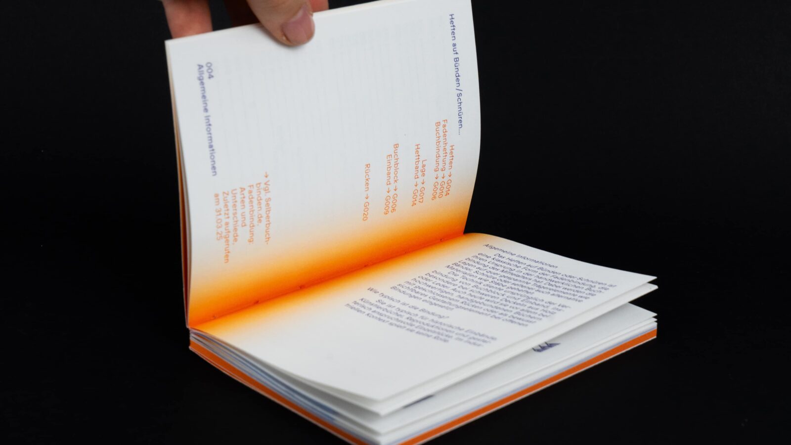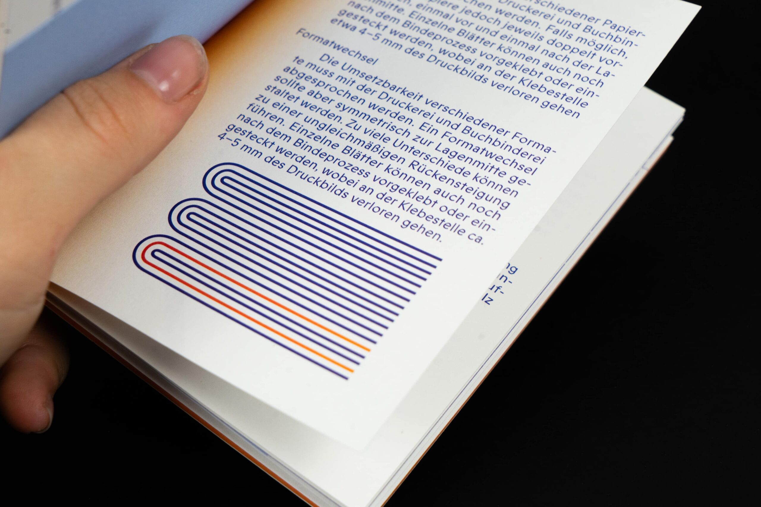 „Zwischen den Stichen“ untersucht Fadenbindungen als gestalterisches Mittel. In einer Box befinden sich handgebundene Einzelhefte, die verschiedene Bindungstechniken erklären, veranschaulichen und haptisch erfahrbar machen. Aspekte wie Fadenführung, Eigenschaften und Hinweise für Gestaltende bieten vielfältige Zugänge. Ein Begleitheft ergänzt das Projekt um theoretischen Hintergrund und gestalterische Einordnung. Ob zum Durchblättern oder zur vertieften Auseinandersetzung – diese Arbeit lädt dazu ein, Buchbindung in der Gestaltung neu zu denken.